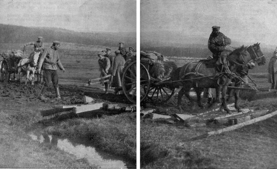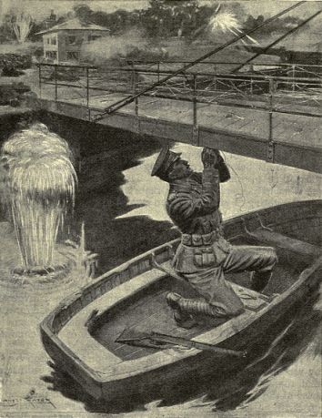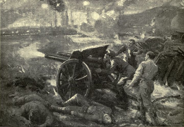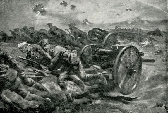 [28]The guns were booming, but there was no sign of the enemy. The front seemed empty of men, but an observer would have seen soft, fleecy clouds hanging above the British trenches—a sign that shrapnel was bursting over them, and that a deadly flail of iron bullets was beating down upon them. Our soldiers, who had learned to take cover in South Africa, lay close, and waited, whiling away the time by joking and by playing marbles with the shrapnel bullets that fell among them. At first the aim of the enemy's artillery was not very good, but speedily their aeroplanes came circling over the trenches, and by throwing down smoky bombs revealed their whereabouts. Then they made very accurate shooting, and many of our men were hit. Meanwhile our artillery began to reply, and more than once silenced a battery of the enemy.
