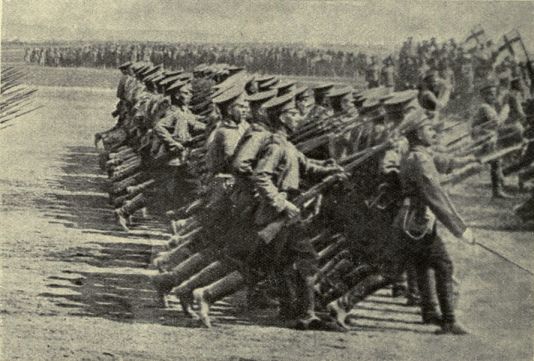 Up to the year 1893 France and Germany had about the same number of soldiers on a peace footing; but very soon Germany began to forge ahead, chiefly because her population grew so rapidly. Soon it was clear that France could not hope to raise so large an army as Germany; so in 1897 she made an alliance with Russia, by which each Power agreed to take part in the other's quarrel if either of them should be attacked. In 1905 France again altered her army law by reducing the time of service with the colours to two years, and by increasing the period of service with the Reserve to eleven years. But even this arrangement did not give her all the soldiers which she needed; so in 1913 she decreed that every Frenchman found fit for service must join the colours at the age of twenty, spend three years in the Regular Army, eleven years in the Regular Reserve, seven years in the Territorial Army, and seven in the Territorial Reserve. Thus every strong and able-bodied Frenchman became liable for military service from his twentieth to his forty-eighth year. [3] Roughly speaking, this new law enabled France to put into the field, a month or so after the beginning of war, about 4,000,000 trained men. This gave her a first line army of about 1,500,000, a second line of about 500,000, and a reserve of about 2,000,000. Germany feared that this new law would so strengthen France that she and Russia combined would be more than a match for her; and one of the reasons why she declared war on August 1, 1914, was to crush the French before the new arrangement could come into full working order.