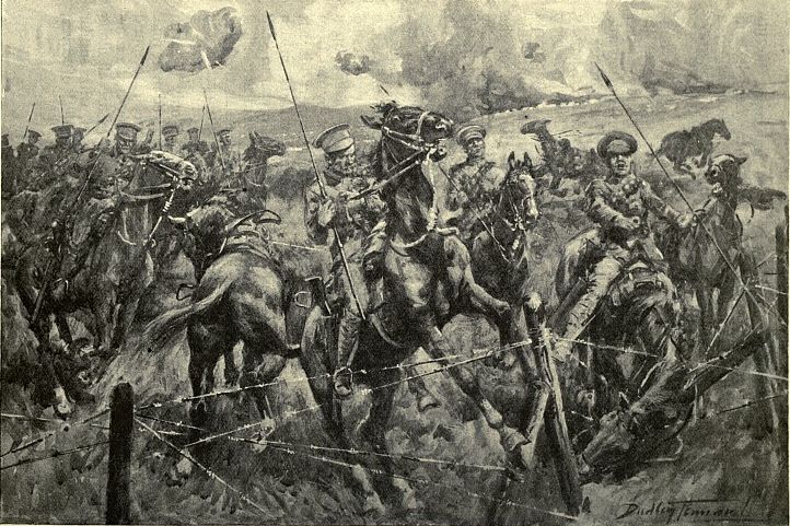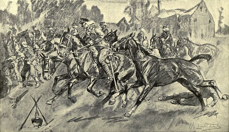 During the 22nd and 23rd of August the 5th Cavalry Brigade and some other cavalry squadrons pushed far to the north, and did some excellent scouting work. They also met the advanced patrols of the enemy, and there were several small fights, in which our troops showed to great advantage. One of these fights took place at the corner of a village street, where a party of our hussars rode down a strong detachment of German cavalry. The two forces met front to front, and there were wild [20] hurrahs as our men charged the enemy with flashing sabres. It was all over in a few minutes, and the Germans were driven back in confusion. "Men and horses were heavier than we were," wrote one of the British hussars who was wounded in the skirmish, "but our men were smarter and handier."