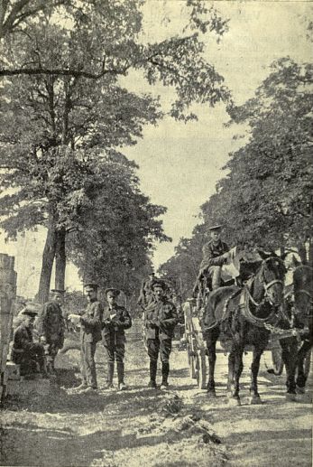 The second surprise was the poor shooting of the German infantry. They fired as they marched, with their rifles at their hips. Though thousands of their bullets whizzed by, very few of them found a mark. "They can't shoot for nuts," said one Tommy; "they couldn't hit a haystack." "They couldn't hit the gas works at Mons," said another. "If they had, I wouldn't be here."