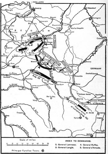 In Chapter XXIII. of Volume I. I told you that the French began their raid upon Alsace on August 7, 1914. At this time some of the Liége forts were still holding out, and the great German advance through Belgium had not yet begun. As the French were able to push into the enemy's country thus early in the war, you may imagine that they were quite ready for action before Belgium was overrun. Not, however, until August 22 were their preparations so far advanced that they could begin the business of war in real earnest.