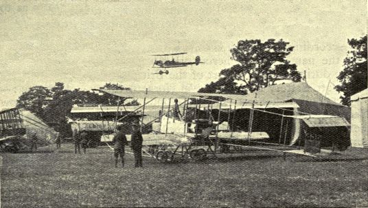It is a peaceful Sunday morning; the sun is shining and the bells are ringing. The Belgians in Mons and the surrounding mining villages are flocking towards their churches; but in the British lines our soldiers are hard at work in their shirt-sleeves deepening the trenches and making ready to meet the threatened attack. As the morning wears on a German Taube[20] comes gliding high over the trenches like a huge vulture seeking its prey. It circles round and round, and more than one enterprising "Tommy" discharges his rifle at it. Now a British aeroplane ascends to give it battle; but the Taube makes a long curve northward, and disappears in rapid flight. Meanwhile our own airmen and cavalry scouts are coming in with the news that large numbers of the enemy are moving through the green woods towards the centre of the line, and that towards Binche and Condé other columns are on the march.