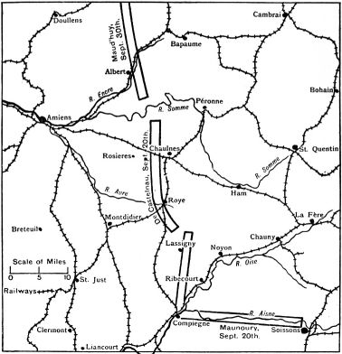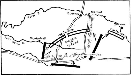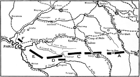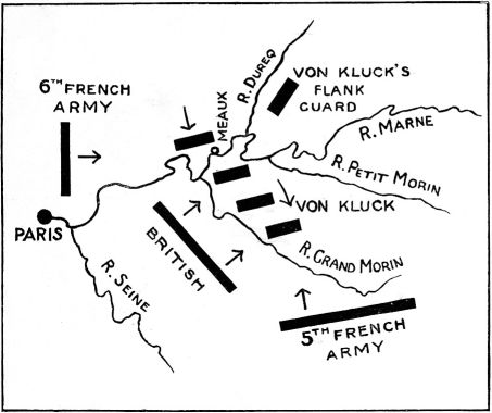 [102] Koo-lom´mee-ay. This was the most southerly point reached by the main body of von Kluck's army. His cavalry patrols reached the banks of the Seine.