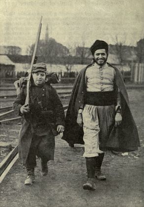 The army of France is inferior in numbers to that of Germany, but it easily ranks as the second of the armies of the world. Our regular army, as you know, is trained in India; France uses her North African colony of Algeria for the same purpose. Her infantry have long been renowned for their dash and spirit, and they are, next to our own regulars, the best marchers in Europe. The Zouaves, with their baggy red trousers and short blue jackets, are picked men. They are to the French army what the Highlanders are to our army—men of the most fearless bravery, and almost irresistible at the charge. The bayonet, which the Highlander calls the "wee bit steel," is their favourite weapon; the Zouave calls it by the poetical name of "Rosalie."