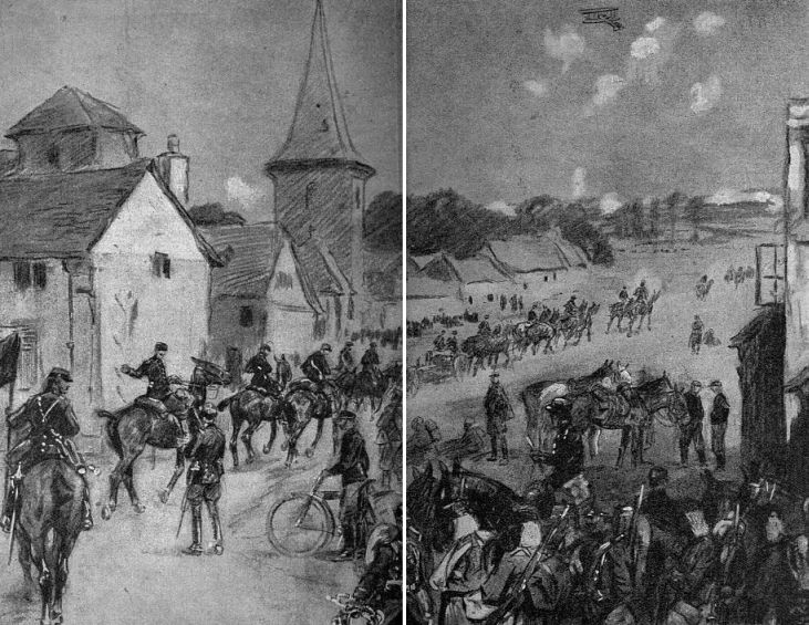 I have described Dinant because it was in and around this town that the French first came into contact with the Germans. In Chapter XXX. of our first volume I told you that after the entry of the Germans into Brussels, von Kluck's army (the First Army), which was to form the extreme right of the German line, was rapidly advancing towards the Franco-Belgian border, and that von Buelow's army (the Second Army) was moving in the direction of the strong fortress of Namur. The first clash of arms between the French and Germans took place five days before the occupation of Brussels, when von Kluck's army was fighting its way towards the capital.