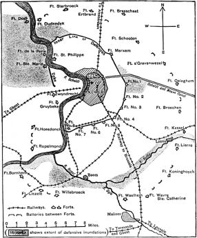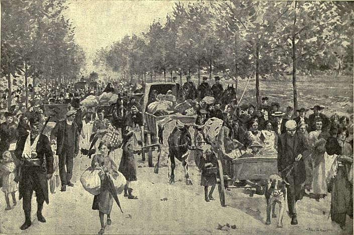 When the commander, General Michel, saw that he could no longer hold out, he tried to call in the troops from the forts and march them westward, in the hope that they might join their comrades beneath the shelter of the forts at Antwerp. Traitors or spies, however, cut his telephone wires, and he was only able to rally a portion of them for the retreat. Two Belgian regiments hacked a way through the Germans who blocked their road, and managed to join the French and reach Rouen; where they took ship to Ostend, and then joined the main Belgian army at Antwerp.