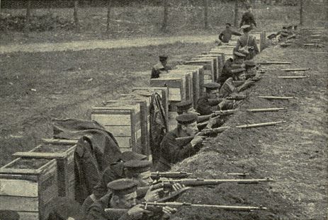 When the infantry of the enemy began to appear our soldiers had three surprises. In the sham battles which they had fought at Aldershot or on Salisbury Plain they had learned to fire at men moving forward in a thin, extended line, with eight or ten paces between them. To their amazement they saw the Germans coming on in dense masses, as though they [29] were parading in the streets of Potsdam. Our men grasped their rifles and waited until the enemy came within six or seven hundred yards of them. On rolled the Germans, singing their national songs, and believing that they could sweep the British out of their trenches by sheer weight of numbers. At last the word was given, and a tornado of rifle and machine-gun fire crashed down upon the dense masses.