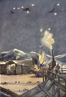 On November 21, 1914, three British aeroplanes flew from France across the mountains into Germany, a distance of 250 miles, and dropped bombs on the Zeppelin factory at Friedrichshafen, on the shores of Lake Constance. Serious damage was done, and all the pilots but one returned safely. Another daring air raid was made on Christmas Day 1914 by seven aeroplanes on German warships lying off Cuxhaven.