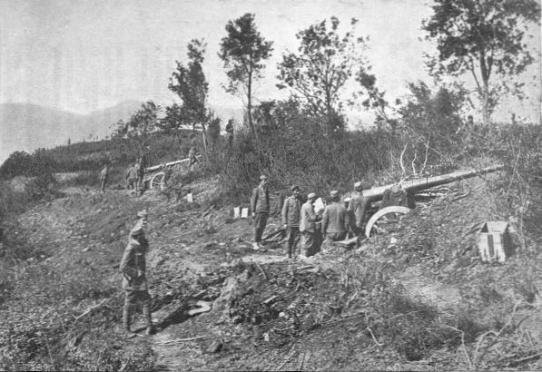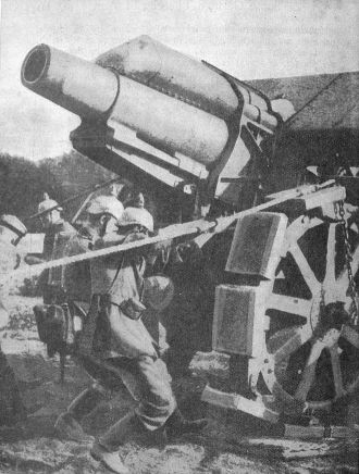 The Austrian and the German General Staff had studied all this very carefully, and they had come to the conclusion that howitzers could be constructed of such a size that they would be more than a match for fortress guns. Former howitzers were 6 inches across at the mouth; but before the war the Austrians built howitzers of from 11 to 12-inch calibre. This doubling of the calibre meant that the new weapon was eight times as powerful as the old one. Such howitzers could throw their shells from an immense distance, and could take advantage of steep cover so far off that the fortress guns could not reach them. Though the new howitzers were so heavy, they were capable of being moved from place to place as soon as they were "spotted".