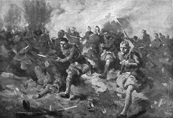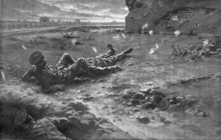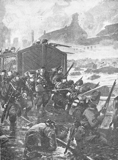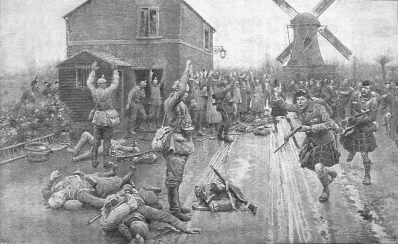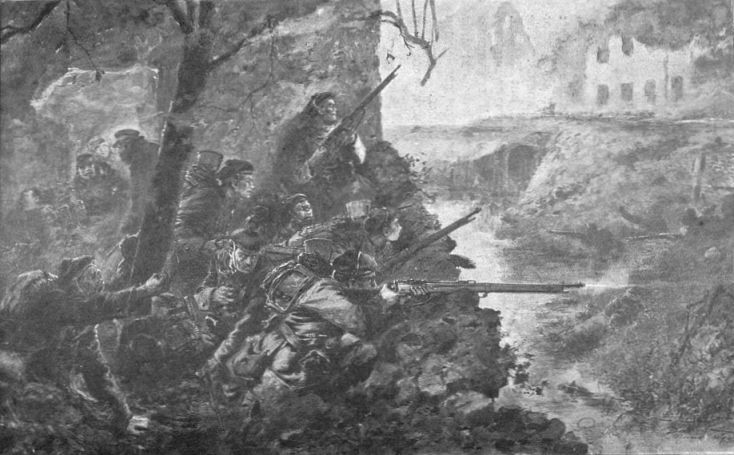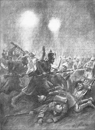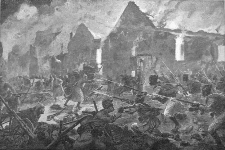 The action here illustrated took place on the South bank of the Marne, where the Germans found themselves attacked by French colonial troops. The Germans were soon beaten back, after a fierce affray amidst burning houses and broken barricades.