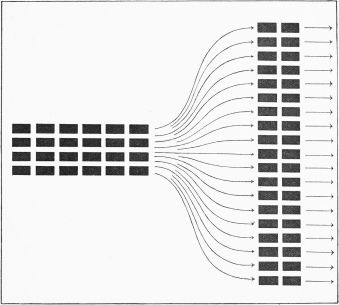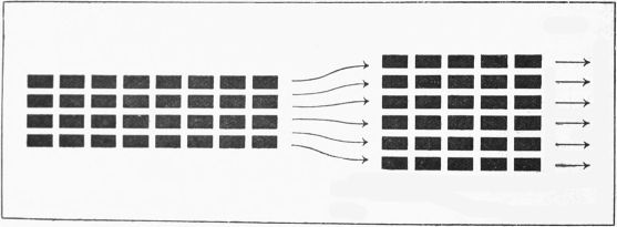 Troops attacking in close order have certain advantages over those attacking in open order. First, they can begin their attack with the least possible delay. Suppose a hundred men are marching forward in fours, and are about to make an attack. If they are to spread out widely time will be needed for them to deploy. (See Fig. 2, p. 19.) But if they go forward packed close together as in Fig. 1, p. 18, they can attack much more quickly. You can easily understand that the quicker a blow is delivered, the more likely it is to be successful, for the defenders are given little time in which to make preparations for resisting it.