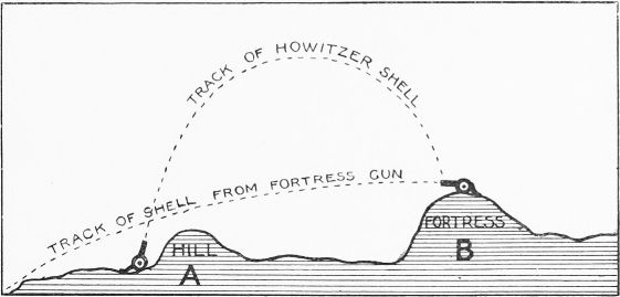 On page 200 of Volume I. you were told how a howitzer differs from an ordinary field gun. Let me repeat what I then said. The great difference between the action of an ordinary gun and that of a howitzer is the difference between a boy throwing a stone at a mark which he can see, and the same boy lobbing a stone over a wall so that it will fall on something hidden from his view. The ordinary field gun has a long, flat sweep of fire, and is therefore unable to shoot over hills, trees, or houses, or to drop shells on men lying close behind a bank or in a deep, narrow trench.