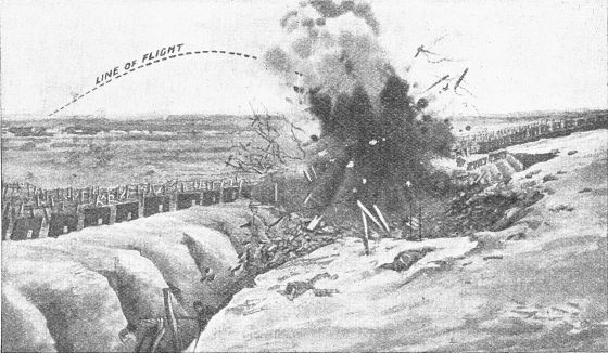 [112] The Minenwerfer, or trench-mortar used by the Germans, has a range of some 500 or 600 yards, and throws a bomb loaded with high explosives, weighing up to 200 lbs. It is fired at extreme elevation from the bottom of a pit in the trench.