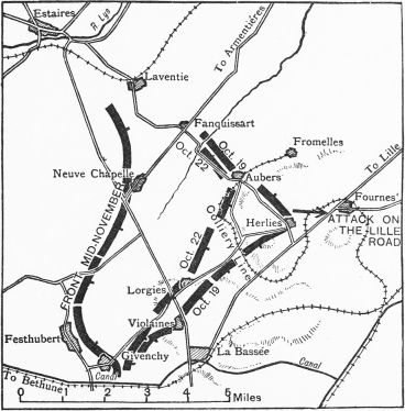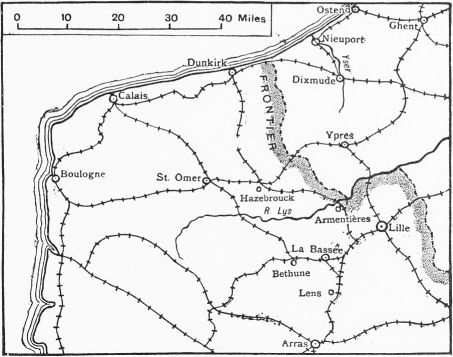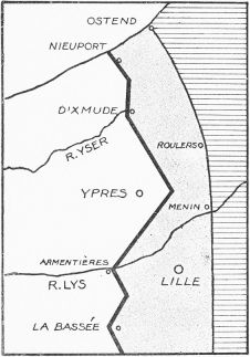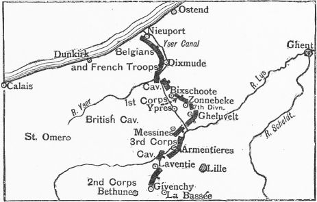 Back they were thrust, but not in rout, to the plateau beyond the Aisne, where, in a position of great strength, they were forced to fight, against all their traditions, on the defensive. For weeks they were besieged, but day by day their entrenchments were strengthened until they resembled fortresses. All the courage and skill and patience of the attackers could not bolt them from these burrows by means of frontal attacks. Then an attempt was made to outflank them by a northward movement of the Allied left. As this movement proceeded, a similar manoeuvre was begun by the foe. Each side attempted to outflank the other, and a feverish race set in for the North Sea, where both flanking movements must perforce end. Three French armies were strung out northwards as far as the La Bassée canal; the British army was transferred from the Aisne to fill the gap beyond; and a new army was collected and hurried to the assistance of the Belgians, who extended the line to the sea. The Allies just won the race, and the Germans found themselves besieged once more, this time on a line of trenches some 450 miles in length. For months to come they strove to break through the Allied lines; with what success future pages of this history will tell.