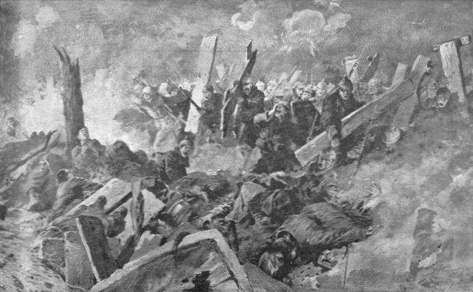 A breach is made in the wire entanglements and the chief force of the
