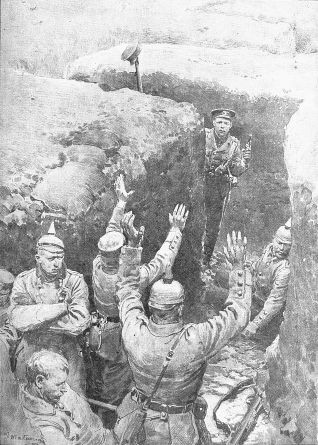 Another theory of the German Staff was that high explosive shells could be used with great effect not only against fortresses but against troops in the field. In former wars shrapnel[4] was largely used, but in the present war the Germans believed that high explosive shells would be more effective.[5] Modern armies, as you know, "dig themselves in" whenever they can, and fight from trenches. Against troops in deep trenches with good head-cover shrapnel is not very deadly. When trenches have been occupied for some time they become little fortresses, with strong parapets and entanglements of barbed wire in front of them. Before sending infantry to attack such trenches, the Germans determined to fire high explosive shells at them, so that the barbed wire would be torn away, the parapets of the trenches would be blown in, and the defensive works destroyed. In this respect, too, the German theory proved correct, and when the trench warfare began in real earnest the Allies had to follow the German example. Months passed, however, before their supply of howitzers and high explosive shells was sufficient to enable them to cope with the Germans on equal terms.