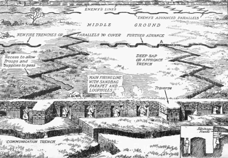 From what you have read in the former volumes you know that the German theory was right, and that the French theory was wrong. Liége, Namur, Maubeuge, and Antwerp all fell before the high explosive shells of the huge howitzers in an astonishingly brief time. Verdun did not fall, it is true, but this was because the French turned it into a new type of fortress altogether. They made field works at a considerable distance from the old forts, and moved out the heavy guns to advanced trenches. Rails were laid down so that as soon as the guns were "spotted" they could be moved to new positions at short notice. Thus, as I told you on page 280 of Volume II., instead of fixed forts, each, say, mounted with ten heavy guns, these same ten guns were "dotted here and there in trenches rapidly established in one place and another, along perhaps half a mile of wooded vale, and free to operate, when they moved, over perhaps double that front." This is the German theory of fortification, and Verdun was saved because the French adopted it.