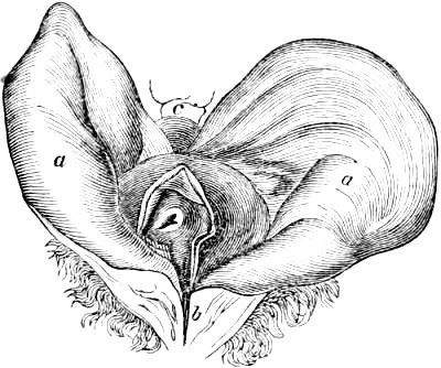 [71] “A ligature upon the navel string is absolutely necessary, otherwise the child will bleed to death; and when tied slovenly, or not properly, it will sometimes bleed to an alarming quantity. As we take such vast care to secure the navel string, you will naturally ask how brutes manage in this particular? I will give you an idea of their method of procedure, by describing what I saw in a little bitch of Dr. Douglas. The pains coming on, the membranes were protruded; in a pain or two more they burst, and the puppy followed. You cannot imagine with what eagerness the mother lapped up the waters, and then, taking hold of the membranes with her teeth, drew out the secundines; these she devoured also, licking the little puppy as dry as she could. As soon as she had done I took it up, and saw the navel string much bruised and lacerated. However, a second labour coming on, I watched more narrowly, and as soon as the little creature was come into the world I cut the navel string, and the arteries immediately spouted out profusely; fearing the poor thing would die, I held it to its mother, who, drawing it several times through her mouth, bruised and lacerated it, after which it bled no more. This, I make no doubt is the practice with other animals.” (Dr. W. Hunter’s Lectures, MS. 1752; from Dr. Merriman’s Synopsis, p. 21. note.)