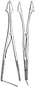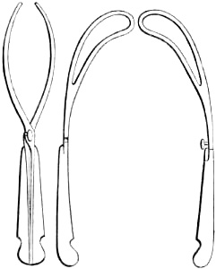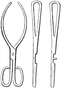 [87] “Quand une fois la tête est hors les parties osseuses, elle ne retrograde plus, je les dêsarticule (the blades) avec la clef placée entre elles en forme de lévier; je les extrais en les inclinant graduellement, car souvent l’extraction un peu brusquée d’une branche produit l’expulsion de la tête.” (La Chapelle.)