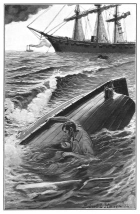 George jumped up from the stern and stretched out his arm to seize the inanimate body of his friend. But the movement was too much for the equilibrium of the frail boat and for the balance of the boy. Out into the water shot George, overturning the craft until its keel was in the air.