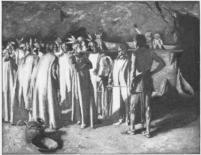 Coyocop’s prediction was fulfilled at dawn. The year which Doña Julia de Aquilar had passed in the City of the Sun had enabled her to read aright the minds of the sun-worshippers after their moonlit attack upon de Sancerre’s island had been repulsed. They had awaited the coming of their gleaming god, and had been rewarded by a sunrise whose splendor should have filled their childish souls with love and peace. But the mounting orb of day was greeted by its idolaters not with gentle hymns of praise, but with wild, warlike shouts, that echoed from the woods and across the flood with a grim, menacing persistence that sent a chill through the hearts of a maiden and her lover, and caused a dare-devil from the northern woods to look with care to the priming of his gun.