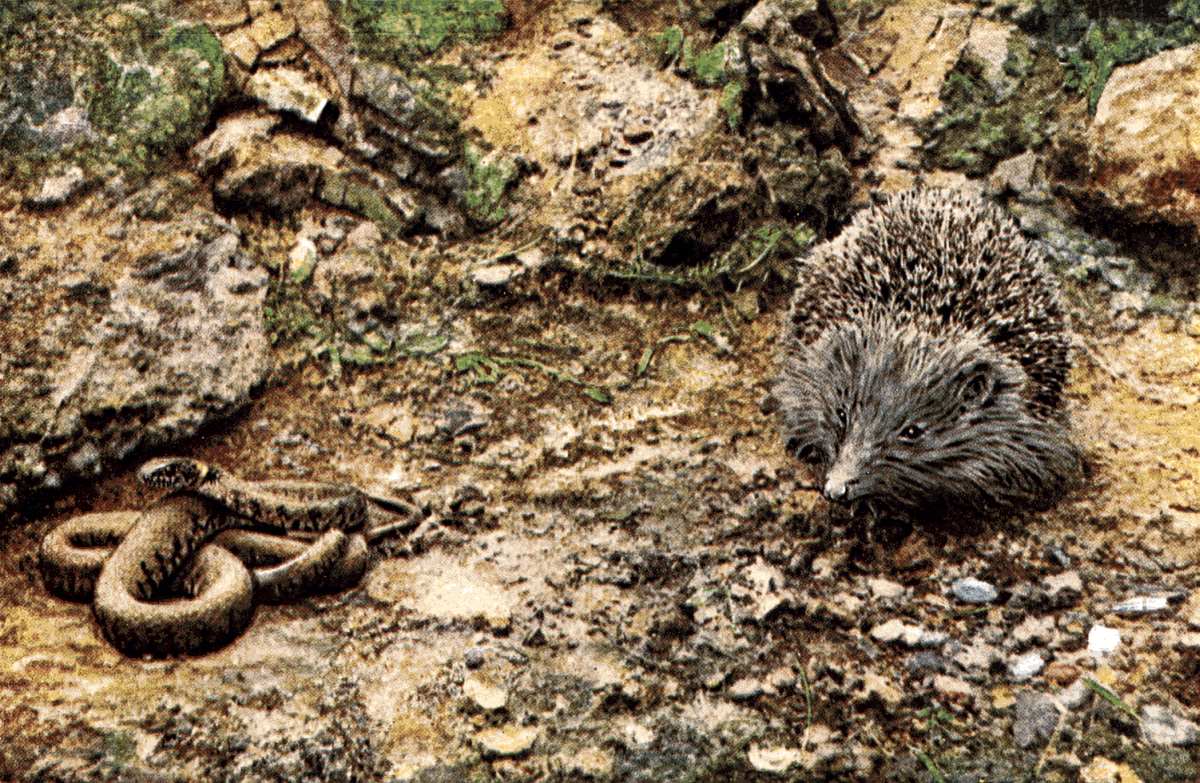 He is said to be capable of killing and eating a wild Rabbit; but, of course, although he runs well, he could never catch a Rabbit unless the rodent were wounded. He is also a good swimmer and climber, not only of trees but of rain-pipes and rough walls, especially where these are creeper-clad. In addition to the food mentioned above he takes slugs and worms, mice, rats, lizards, frogs, and snakes—including the Viper to whose poison he is immune. It is certain that it fights with Rats, and Lord Lilford has told how it cleared a garden of them; but the Rat is sometimes the victor and eats the Hedgehog. The Hedgehog on occasion will indulge in a feast of carrion.