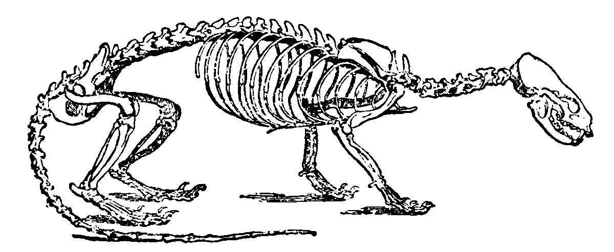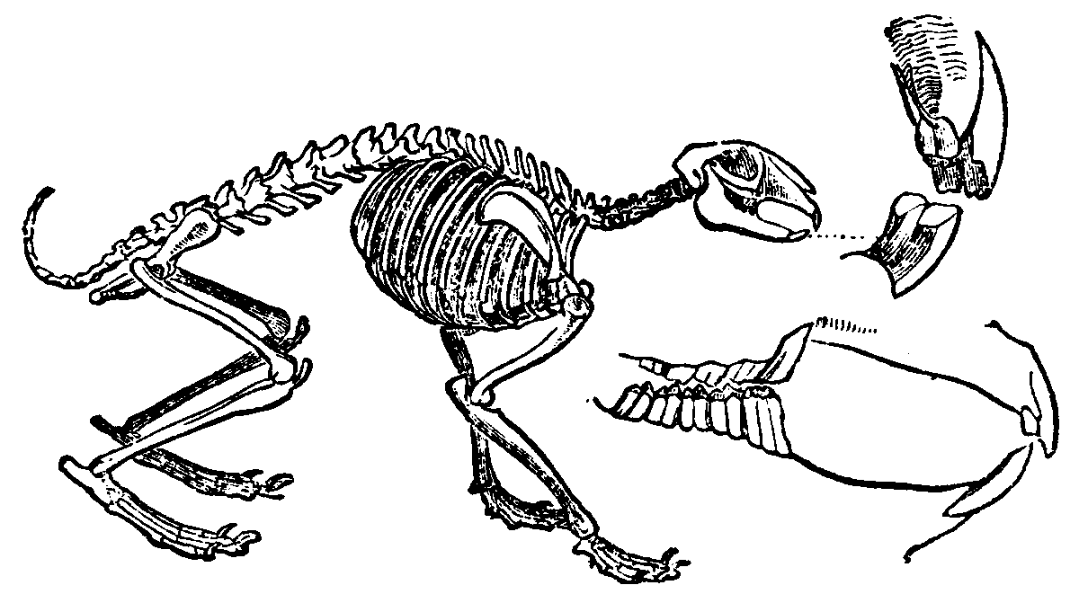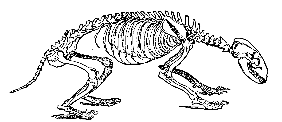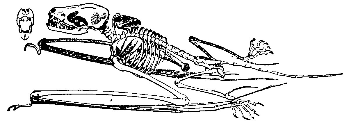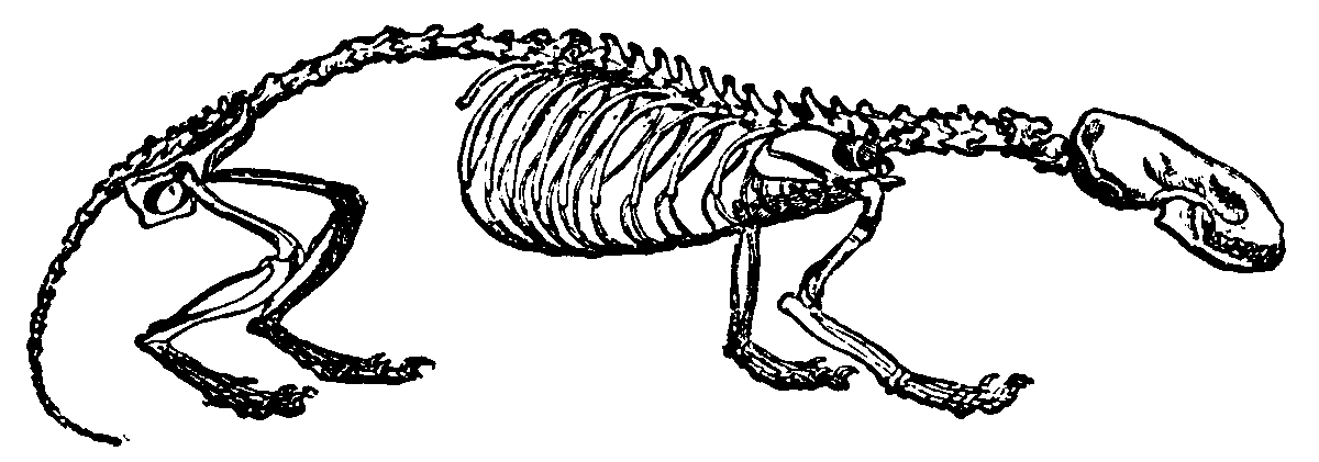 The existing British Mammals represent the six orders Insectivora (shrews, mole, and hedgehog), Chiroptera (bats), Carnivora (beasts of prey), Rodentia (gnawing animals), Cetacea (whales and dolphins), and Ungulata (hoofed animals). These all agree with the Reptiles and Batrachians in having a many-jointed internal skeleton, a bony framework giving support to a system of powerful muscles; and of this framework the most important feature is the long backbone or vertebral column consisting of a number of bony rings jointed together by outgrowths or "processes," and held in position by strong ligaments. This attachment of the rings by their flat surfaces produces the spine or vertebral column, with a canal on its upper half in which lies the spinal cord. This column, for descriptive purposes, is divided into regions—cervical, dorsal, lumbar, sacral, and caudal. The number of rings or vertebræ in each region varies somewhat in the different classes and orders, but as a rule the cervical or neck vertebræ are seven; the dorsal, to which the ribs are connected, are about thirteen (extreme numbers are nine and twenty-two); the vertebræ of the lumbar or loin region are usually six or seven, but they vary inversely to those of the dorsal from two to twenty-three; the sacral vertebræ (about five) are in the adult fused together into a solid bone (sacrum) of triangular shape; the caudal vertebræ vary from three (man) to nearly fifty, according to the length of tail common to the genus or species.