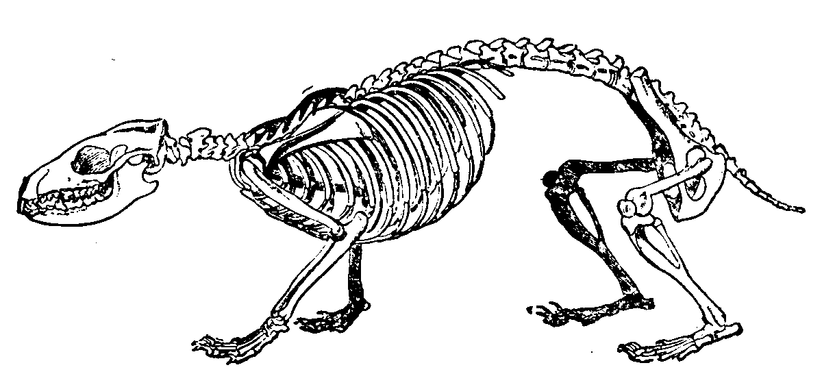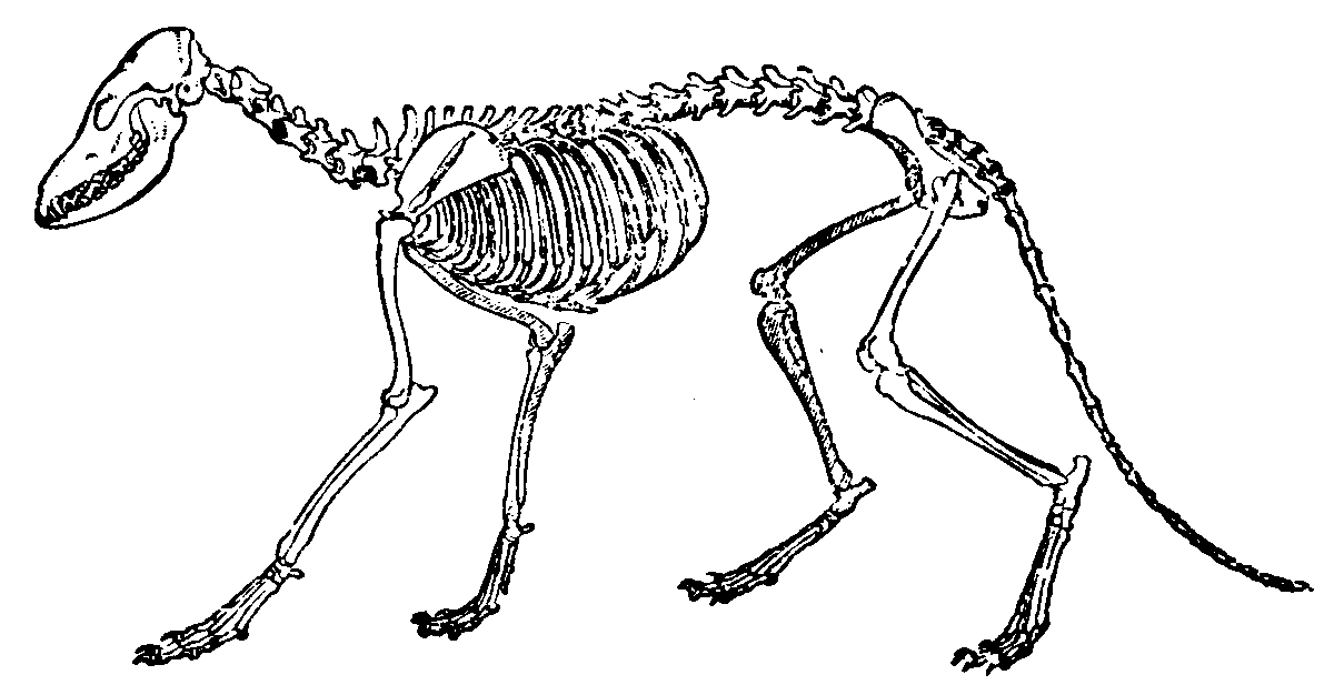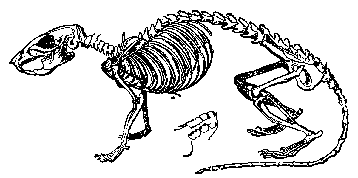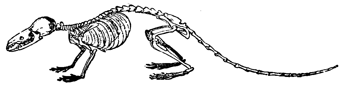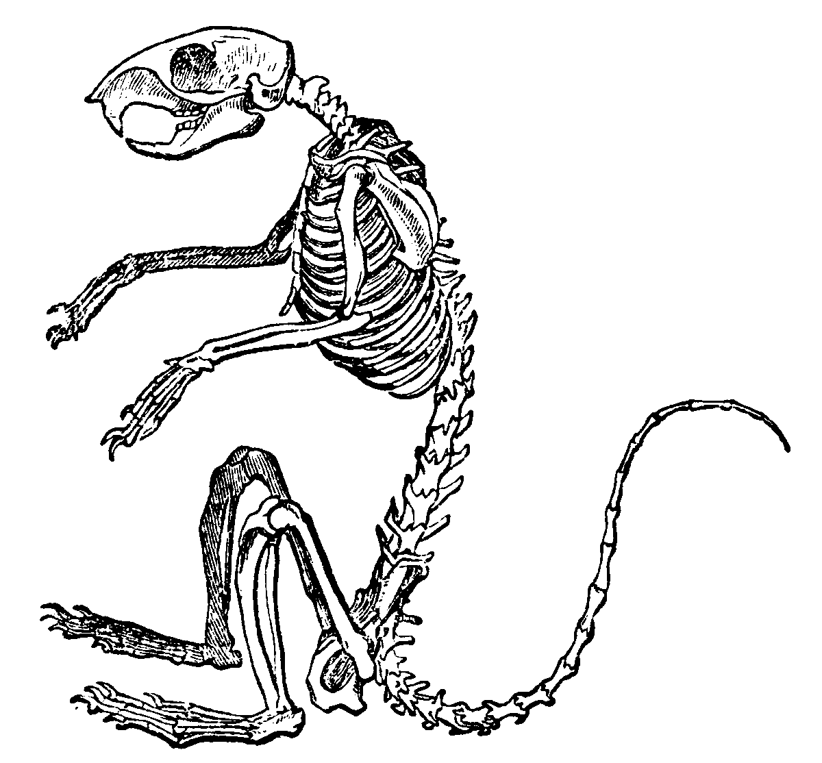 The existing British Mammals represent the six orders Insectivora (shrews, mole, and hedgehog), Chiroptera (bats), Carnivora (beasts of prey), Rodentia (gnawing animals), Cetacea (whales and dolphins), and Ungulata (hoofed animals). These all agree with the Reptiles and Batrachians in having a many-jointed internal skeleton, a bony framework giving support to a system of powerful muscles; and of this framework the most important feature is the long backbone or vertebral column consisting of a number of bony rings jointed together by outgrowths or "processes," and held in position by strong ligaments. This attachment of the rings by their flat surfaces produces the spine or vertebral column, with a canal on its upper half in which lies the spinal cord. This column, for descriptive purposes, is divided into regions—cervical, dorsal, lumbar, sacral, and caudal. The number of rings or vertebræ in each region varies somewhat in the different classes and orders, but as a rule the cervical or neck vertebræ are seven; the dorsal, to which the ribs are connected, are about thirteen (extreme numbers are nine and twenty-two); the vertebræ of the lumbar or loin region are usually six or seven, but they vary inversely to those of the dorsal from two to twenty-three; the sacral vertebræ (about five) are in the adult fused together into a solid bone (sacrum) of triangular shape; the caudal vertebræ vary from three (man) to nearly fifty, according to the length of tail common to the genus or species.