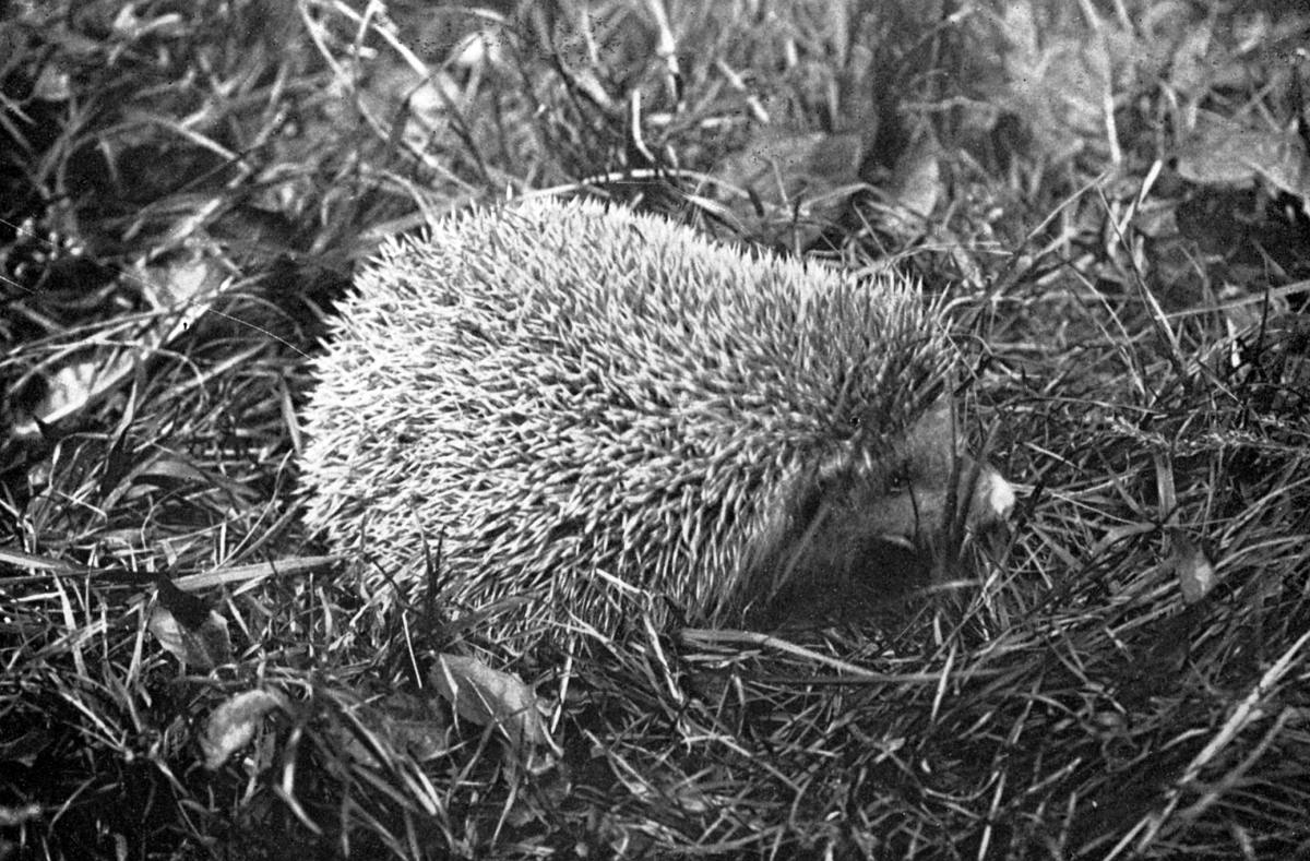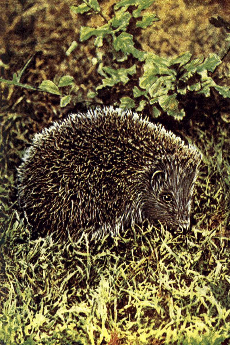 The Hedgehog, Urchin or Hedgepig is so distinct from every other British mammal, that anybody could correctly name it at sight. The development of many of its hairs into long, stiff spines gives it an individuality that is not to be confused with any other; but there are other peculiarities, such as the extreme shortness of the head and neck in comparison with the bulk of its body, and the muscular power that enables it to remain rolled into a ball with every part protected by erected spines. But for the fact that the Hedgehog is frequently introduced into houses and gardens to keep down insect pests, few town-dwellers would have had the opportunity of seeing the Hedgehog alive; for it is a nocturnal beast coming from its retreat only at dusk and hunting through the night. There are, however, exceptions to this rule when a heavy summer downpour of rain has drenched the herbage and caused the snails and slugs to show considerable activity. Then the Hedgehog wakens also, and reduces their numbers; for it is with such fare, plus insects, worms, mice, rats, frogs, lizards and snakes, that the Hedgehog maintains his portliness. He passes the day under a heap of dead leaves or moss in a spinney or thick hedgerow, and the solitary observer in such places may sometimes be guided to this retreat by his snoring!