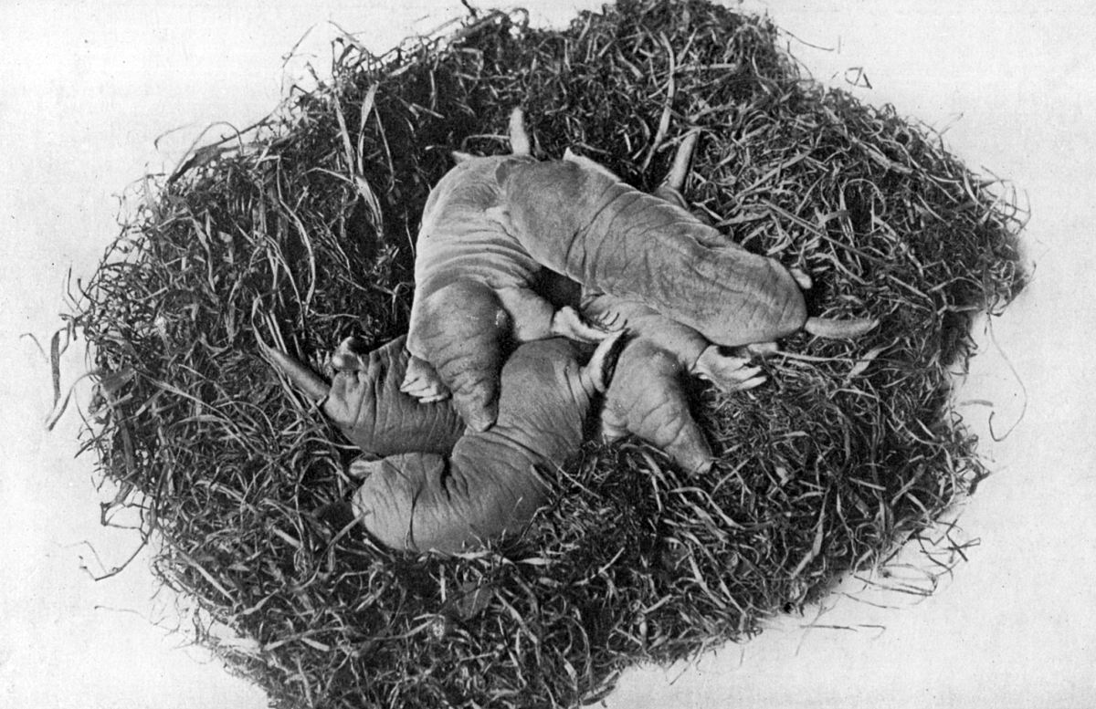 The male and female are known respectively as Boar and Sow, to carry out the idea that they are a lesser kind of pig. Though the males are very quarrelsome among themselves, they have the domestic virtue and mate for life. Some time between the end of June and the end of August, the female produces a litter of four to seven blind and helpless young, sparsely clad with pale, flexible spines, and the ears drooping. The spines gradually stiffen and become first dull grey, then brown and ringed with three bands, of which the middle one is dark and the others light. The spines are arranged in radiating groups, surrounded by coarse harsh fur. Normally, these spines lie flat upon the body, but can be erected at will. They cover the entire upper surface with the exception of the short conical head [Pg 12] and stumpy little tail—which is shorter even than the short rounded ear. The head and underside are clothed with harsh fur of a dirty brown or dirty white colour. In Devon and Cornwall it is known as Furze-a-boar. It expresses its feelings by means of a quiet grunt; the youngsters by a squeak.
