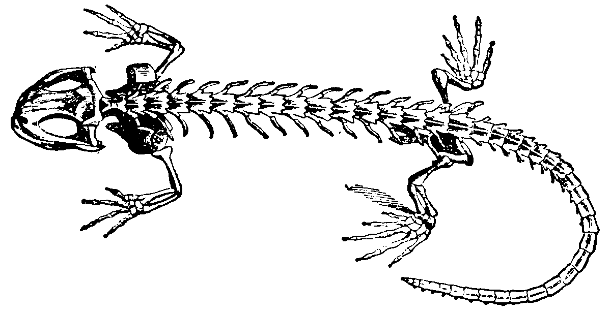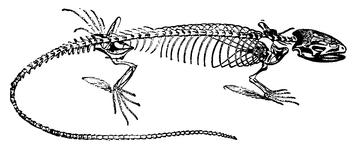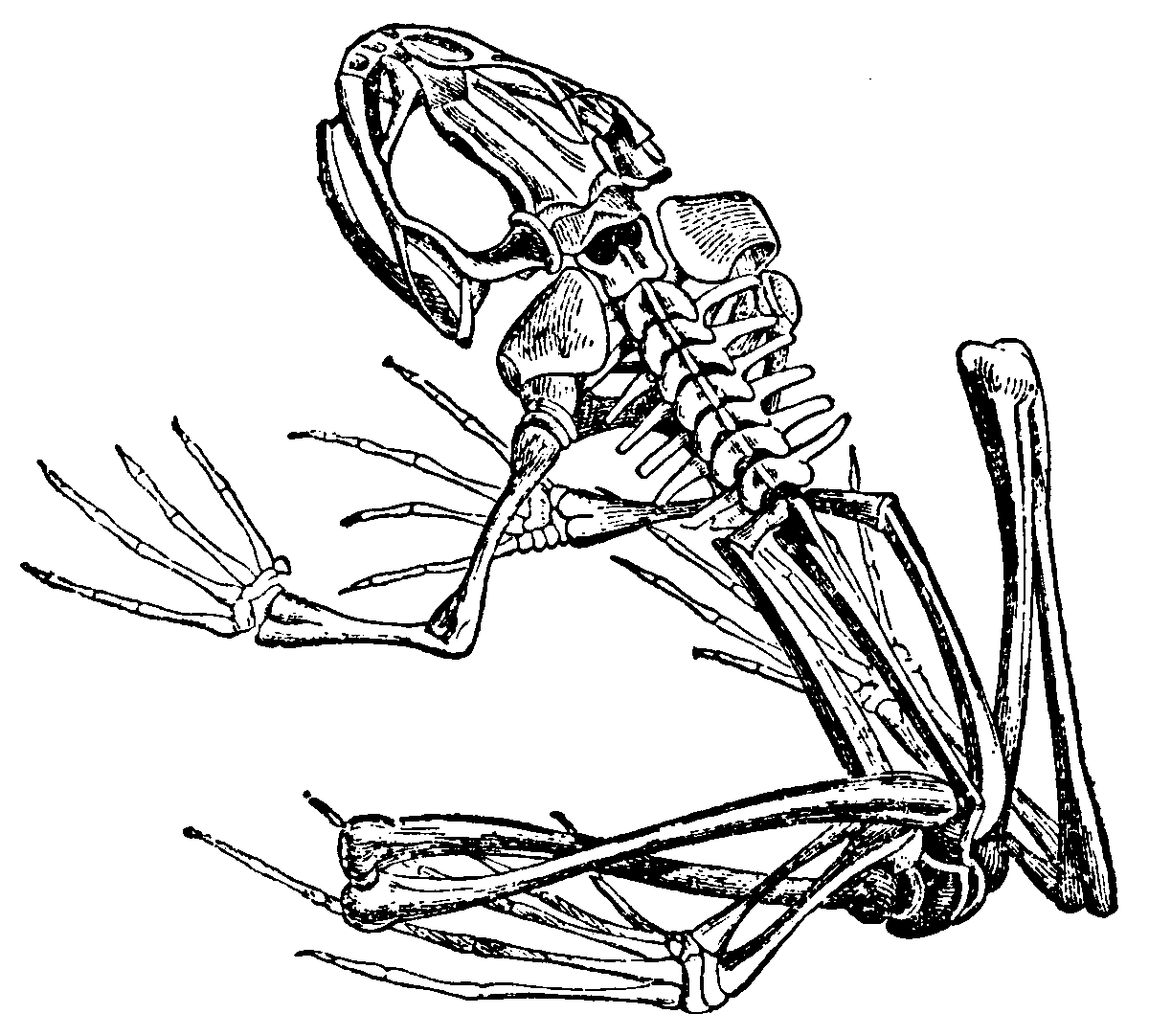 The ribs are attached to the dorsal vertebræ, and connect by cartilage at the other end with the sternum or breastbone—really a series of united bones in the middle line of the chest (thorax). The blade-bones (scapula) of the forelimbs are attached to the upper ribs by the flat or concave side; and the hinder limbs are connected strongly to the sacrum by means of the hip-bones which are united below to form the pelvis, to which the thigh-bone is jointed. The Reptiles and Amphibians exhibit some differences in their skeletal structure which will be pointed out later.