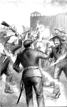 Fully sixty Indians and a score of desperadoes were now within the stockade, and it looked as if all was lost to our friends. A part of the regulars were fighting at the entrance to the stable, but the majority were gathered around Captain Moore at the entrance to the officers' quarters. Behind these were the ladies of the fort and the officers who were sick.