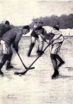 The goal warmed the hearts of the Oak Hall seven wonderfully, and when the puck was again placed in position, they went for it like hungry cats after a mouse. The exchange of blows was rapid, and the disc was stolen and recovered half a dozen times in as many seconds. Then came a long drive by Ben, and another by Dave, and then a Rockville player sent it out of bounds. Bringing it back gave the lads time to recover their breath, and again they went at it with a determination that was terrific.