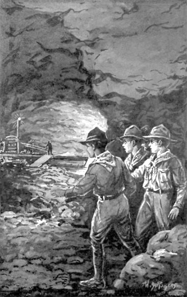 From the authorities it was learned that Slogwell Brown had owned a large portion of the[307] shore front lying between Camp Huxwell and Camp Barlight. He had sold all his holdings to the government, but this had not prevented the unscrupulous man from making a deal with some German agents for the use of the cave under the cliff by our country’s enemies.