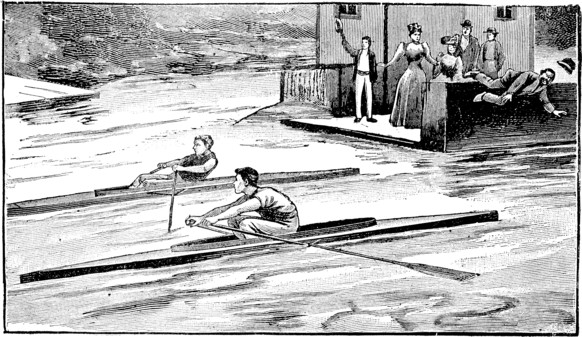 Quicker than it can be related, four oars fell into the water and four sturdy arms bent to the task of sending two beautiful single-shell craft skimming over the smooth surface of the lake.