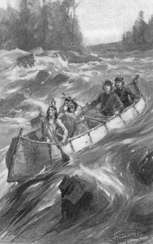 It was fortunate, perhaps, that Deerfoot and Mul-tal-la were compelled to give attention to the management of the craft, for the river abounded with rapids, most of which were dangerous. Often a single false stroke would have sent the boat against the rocks which reared their heads in every part of the stream. Some protruded several feet above the surface, some only a few inches, while others were located by the peculiar eddying of the current as it whirled over and past them. These were the most to be feared, for they would rip out the bottom of the canoe like the sweep of a broadaxe. But you know the consummate skill of the young Shawanoe in handling a canoe. His quick eye, his unerring stroke, his great power, his instant decision and faultless judgment had been trained from early boyhood on the streams of the East, and, though he was now passing down a river he had never seen before, he read all its “signs” as you would read a printed page.