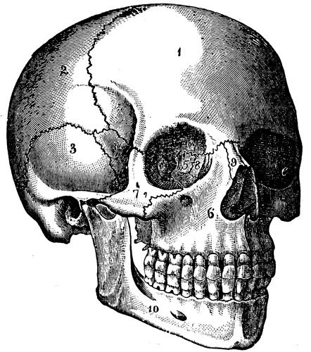 THE SKULL.—(1) Frontal Bone, (2) Parietal Bone, (3) Temporal Bone, (6) Superior Maxillary (Upper Jaw) Bone, (7) Malar Bone, (9) Nasal Bone, (10) Inferior Maxillary (Lower Jaw) Bone