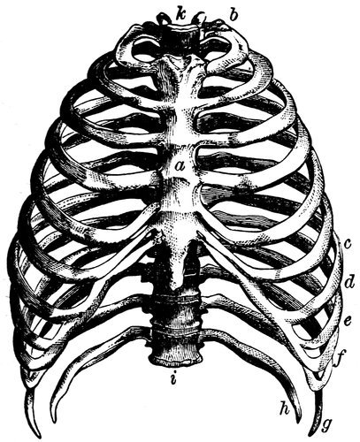THE CHEST.—(a) The Sternum or Breastbone, (b to c) the True Ribs, (d to f) the False Ribs, (g, h) the Floating Ribs, (i to k) the Dorsal Vertebræ.