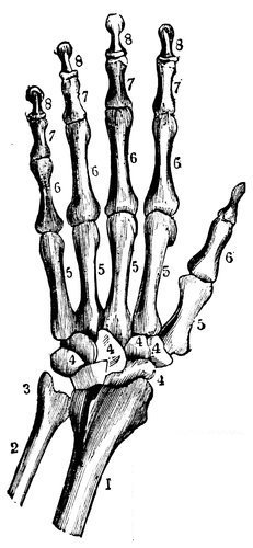 THE HAND.—(1) Radius, (2) Ulna, (4-4) Bones of the Wrist, (5-5) Bones of the Hand, (6-6) Bones of the Fingers.