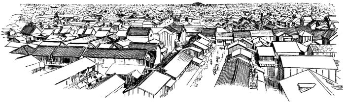[pg 1]A BIRD'S-EYE view of a large city in Japan presents an appearance quite unlike that presented by any large assemblage of buildings at home. A view of Tokio, for example, from some elevated point reveals a vast sea of roofs,—the gray of the shingles and dark slate-color of the tiles, with dull reflections from their surfaces, giving a sombre effect to the whole. The even expanse is broken here and there by the fire-proof buildings, with their ponderous tiled roofs and ridges and pure white or jet-black walls. These, though in color adding to the sombre appearance, form, with the exception of the temples, one of the most conspicuous features in the general monotony. The temples are indeed conspicuous, as they tower far above the pigmy dwellings which surround them. Their great black roofs, with massive ridges and ribs, and grand sweeps and white or red gables, render them striking objects from whatever point they are viewed. Green [pg 2] masses of tree-foliage springing from the numerous gardens add some life to this gray sea of domiciles.