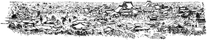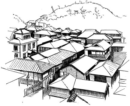 Having got such a bird's-eye view of one city, we have seen them all,—the minor variations consisting, for the most part, in the inequalities of the sites upon which they rest. A view of Kioto, for example, as seen from some high point, is remarkably beautiful and varied, as the houses creep out between the hills that hem it in. In Nagasaki the houses literally rise in tiers from the water's edge to the hills immediately back, there to become blended with the city of the dead which caps their summits. A view of Nagasaki from the harbor is one of surpassing interest and beauty. Other large cities, such as Sendai, Osaka, Hiroshima, and Nagoya present the same uniform level of roofs.