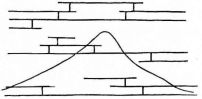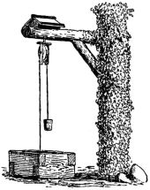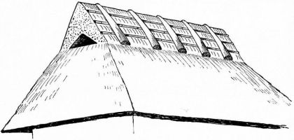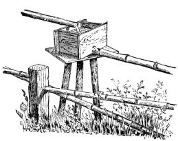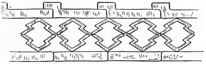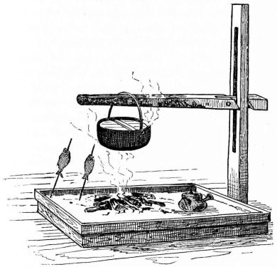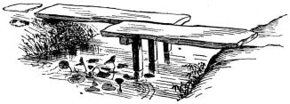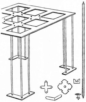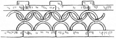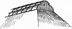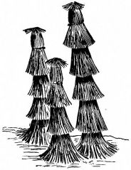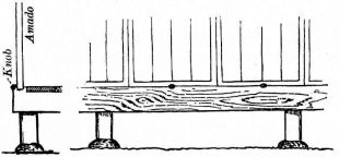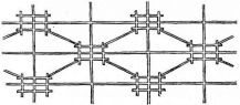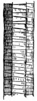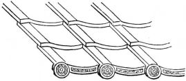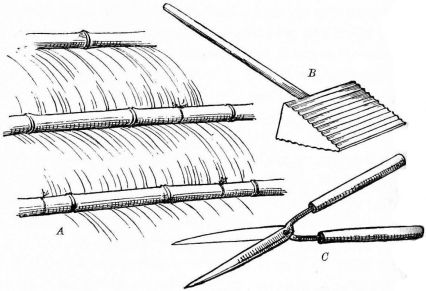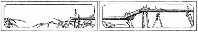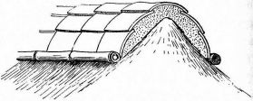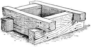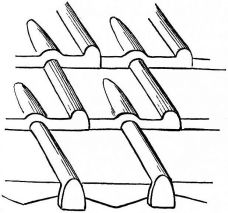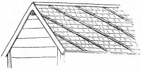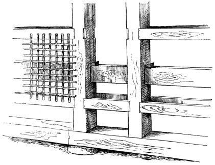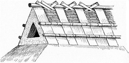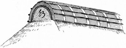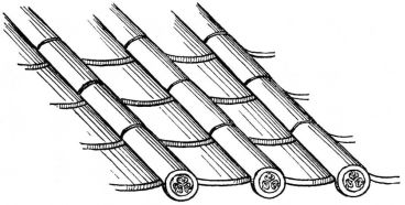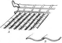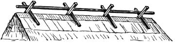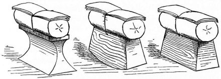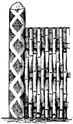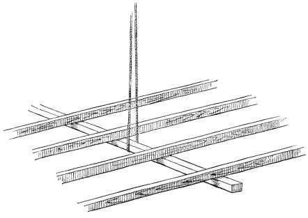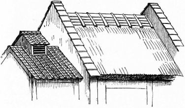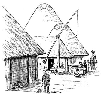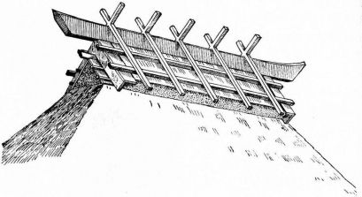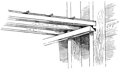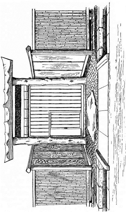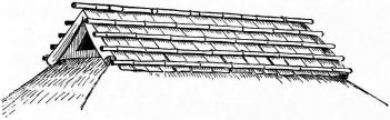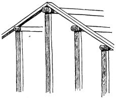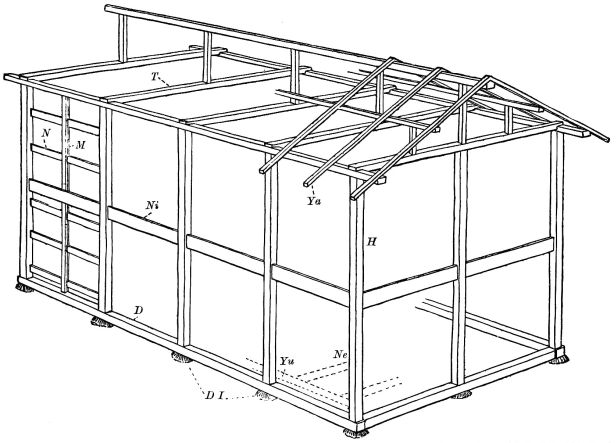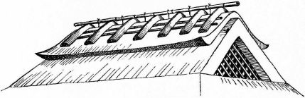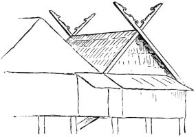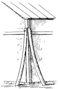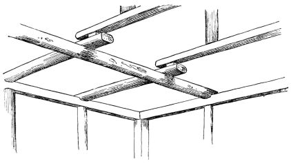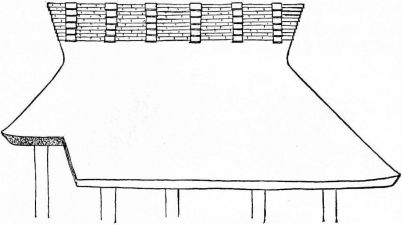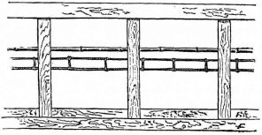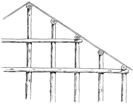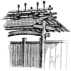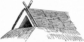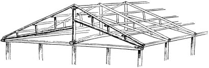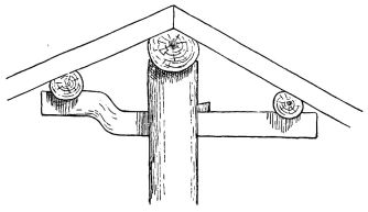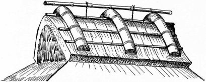 For a narrow house, if the roof be a gable, a central upright at each end of the building gives support to the ridge-pole from which the rafters run to the eaves (fig. 8). If the building be wide, a transverse beam traverses the end of the building on a level with the eaves, supported at intervals by uprights from the ground; and upon this short uprights rest, supporting [pg 19] another transverse beam above, and often three or more tiers are carried nearly to the ridge. Upon these supports rest the horizontal beams which run parallel with the ridge-pole, and which are intended to give support to the rafters (fig. 9).