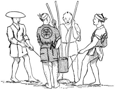 For drilling holes a very long-handled awl is used. The carpenter seizing the handle at the end, between the palms of his hands, and moving his hands rapidly back and forth, pushing down at the same time, the awl is made rapidly to rotate back and forth; as his hands gradually slip down on the handle he quickly seizes it at the upper end again, continuing the motion as before. One is astonished to see how rapidly holes are drilled in this simple, yet effective way. For large holes, augers similar to ours are used. Their chisel is also much like ours in shape. For nailing in places above the easy reach of both hands they use a hammer, one end of which is prolonged to a point; holding, then, a nail between the thumb and finger with the hammer grasped in the same hand, a hole is made in the wood with the pointed end of the hammer, the nail inserted and driven in.
