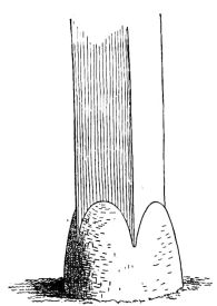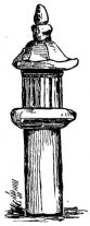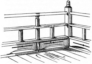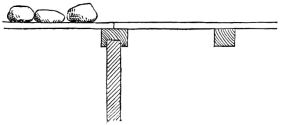 The accurate way in which the base of the uprights is wrought to fit the inequalities of the stones upon which they rest, is worthy of notice. In the Emperor's garden we saw a two-storied house finished in the most simple and exquisite manner. It was, indeed, like a beautiful cabinet, though disfigured by a bright-colored foreign carpet on its lower floor. The uprights of this structure rested on large oval beach-worn stones buried endwise in the ground; and upon the smooth rounded portions of the stones, which projected above the level of the ground to a height of ten inches or more, the uprights had been most accurately fitted (fig. 6). The effect was extremely light and buoyant, though apparently insecure to the last degree; yet this building had not only withstood a number of earthquake shocks, but also the strain of severe typhoons, which during the summer months sweep over Japan with such violence. If the building be very small, then the frame consists of four corner-posts running to the roof. In dwellings having a frontage of two or more rooms, other uprights occur between the corner-posts. As the rooms [pg 17] increase in number through the house, uprights come in the corners of the rooms, against which the sliding-screens, or fusuma, abut. The passage of these uprights through the room to the roof above gives a solid constructive appearance to the house. When a house has a verandah,—and nearly every house possesses this feature on one or more of its sides,—another row of uprights starts in a line with the outer edge of the verandah. Unless the verandah be very long, an upright at each end is sufficient to support the supplementary roof which shelters it. These uprights support a crossbeam, upon which the slight rafters of the supplementary roof rest.