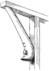 This cross-beam is often a straight unhewn stick of timber from which the bark has been removed (fig. 49). Indeed, most of the horizontal framing-timbers, as well as the rafters, [pg 18] are usually unhewn,—the rafters often having the bark on, or perhaps being accurately squared sticks; but in either case they are always visible as they project from the sides of the house, and run out to support the overhanging eaves. The larger beams and girders are but slightly hewn; and it is not unusual to see irregular-shaped beams worked into the construction of a frame, often for their quaint effects (fig. 7), and in many cases as a matter of economy (fig. 39).
