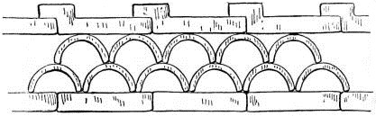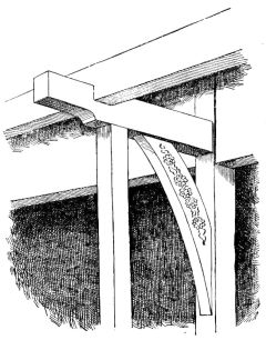 The beams that support the roofs of the fire-proof buildings, or kura, are usually rough-hewn and of ponderous dimensions. It would seem that here, at least, the foreign method of trussing might be an economy of material, besides giving much greater strength; and yet the expense of reducing these beams to proper dimensions, in the absence of saw-mills and other labor-saving machinery, with the added expense of iron rods, bolts, etc., would more than counterbalance the saving of material (fig. 11). In Fig. 11 is shown the universal method of roof support; namely, horizontal beams resting upon perpendicular walls, these in turn supporting vertical beams, which again give support to horizontal beams. That the Japanese have been familiar with the arch is seen in some of their old stone bridges; but they seem as [pg 21] averse to using this principle in their house-architecture as were the Egyptians and Hindus. Fergusson, in his illustrated Handbook of Architecture, page xxxv, says: “So convinced were the Egyptians and Greeks of this principle, that they never used any other construction-expedient than a perpendicular wall or prop, supporting a horizontal beam; and half the satisfactory effect of their buildings arises from their adhering to this simple though expensive mode of construction. They were perfectly acquainted with the use of the arch and its properties, but they knew that its employment would introduce complexity and confusion into their designs, and therefore they wisely rejected it. Even to the present day the Hindus refuse to use the arch, though it has long been employed in their country by the Mahometans. As they quaintly express it, ‘an arch never sleeps;’ and it is true that by its thrusting and pressure it is always tending to tear a building to pieces. In spite of all counterpoises, whenever the smallest damage is done it hastens the ruin of a building which, if more simply constructed, might last for ages.”