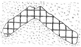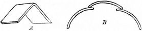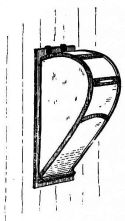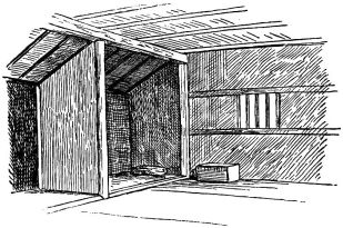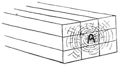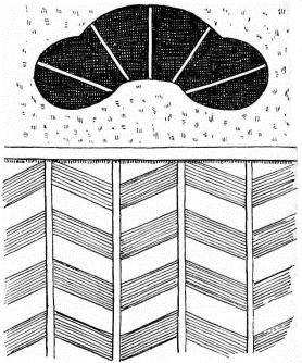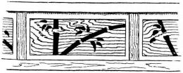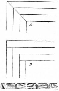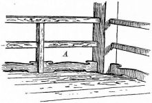 In the finish of the rooms great care is shown in the selection and preparation of the wood. For the better rooms the wood is [pg 25] selected as follows: First, a stick of timber is sawed (fig. 16),—the central piece (A) being rejected as liable to split. Second, in the round upright post that in most instances forms the front of the shallow partition that divides one end of the best room into two bays or recesses, a deep groove is cut, to admit the edge of the partition (fig. 17). By this treatment the wood is not so apt to check or split.