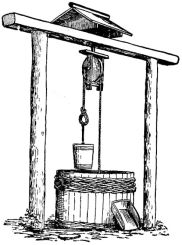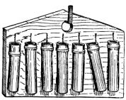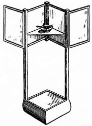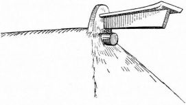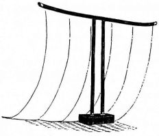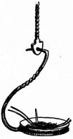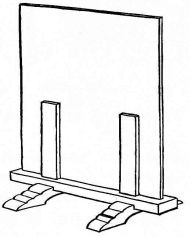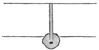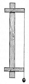 A plumb-line is made with a strip of wood four or five feet in length, to each end of which is nailed, at right angles, a strip of wood four or five inches long, projecting an inch on one side. These two transverse strips are of exactly the same length, and are so adjusted to the longer strip as to project the same distance. From the longer arm of one of these pieces is suspended a cord with a weight at the lower end. In plumbing a wall, the short ends of the transverse pieces are brought against the wall or portion to be levelled, and an adjustment is made till the cord just touches the edge of the lower arm. The accompanying sketch (fig. 31) will make clear the appearance and method of using this simple device.