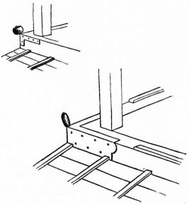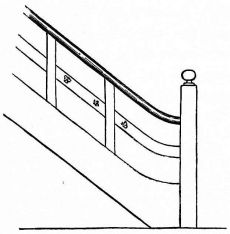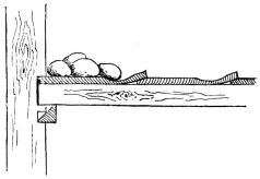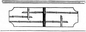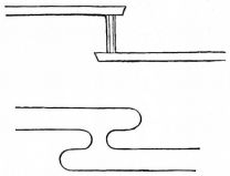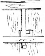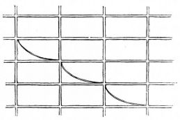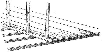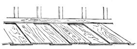 The ordinary ceiling in a Japanese house consists of wide thin boards, with their edges slightly overlapping. These boards at first sight appear to be supported by narrow strips of wood like slender beams, upon which the boards rest (fig. 96). On reflection, however, it soon becomes apparent that these diminutive cross-beams, measuring in section an inch square or less, are altogether inadequate to support the ceiling, thin and light as the boards composing it really are. As one examines the ceiling, he finds no trace of pin or nail, and finally comes to wonder how the strips and boards are held in place, and why the whole ceiling does not sag.5 The explanation is that the strips upon which the boards are to rest are first stretched across the room at distances apart varying from ten to eighteen [pg 28] inches. The ends of these strips are supported by a moulding which is secured to the uprights of the wall. In cheap houses this moulding in section is angular; notches are cut in the uprights, and into these notches the sharp edge of the angular moulding rests and is secured (fig. 19). The moulding is cut in this way to economize material. The strips having been adjusted, they are brought to a uniform level, but crowning slightly,—that is, the centre is a little higher than the sides,—and are held in place either by a long board being placed temporarily beneath them, and propped up from the floor below; or else a long stick is placed beneath them, which is supported by a stout string from the rafters above (fig. 20). A low staging is then erected on the floor (the stud of the room rarely being over seven or eight feet); and the carpenter standing between the cross-strips, while elevated upon the staging, adjusts [pg 29] the boards, one after the other, as they are passed up to him. The first board is placed against the wall, its edge fitting into a groove in the uprights; the next board is placed with its edge on the first board, and then nailed from above, with wooden or bamboo pegs, to the cross-strips. Thus it is that no nail or peg holes appear in the ceiling from below. Board after board is thus placed in position, each board lapping slightly over the one before it, and each in turn being slightly nailed to the strips. Each board has a deep wide groove ploughed out near its lapping edge, so that it bends very readily, and is thus brought down on the strip below. When the boards are carried in this manner half way across the room, a long, narrow, and thick piece of wood, say six feet in length, is placed on the last board laid, within an inch of its free edge and parallel to it. This piece is firmly nailed to the board upon which it rests, and into the cross-strips below. To the edge of this piece two or three long strips of wood are nailed vertically, the upper ends being nailed to the nearest rafters above. In this way is the ceiling suspended (fig. 21). After this has been done, the remaining boards of the ceiling are placed in position and secured, one [pg 30] after another, until the last is reached. To secure the last one in position the carpenter gets down from his position and adopts other methods. One method is to place this board on the last one secured and weight it with a few heavy stones, and then it is moved along from below and placed in position, where it remains quite as firm as if it had been lightly nailed (fig. 22). In case there is a closet in the room or a recess, the last board is sawed into two or three lengths, and these are placed in position, one after another, and nailed from above to the cross-strips,—care being taken to have these sections come directly over the cross-strips, so that from below the appearance is that of a continuous board. The sections are so arranged, as to length, that the last piece comes in the closet; and this may either be weighted with stones or left out altogether (fig. 23)
