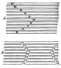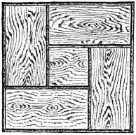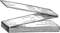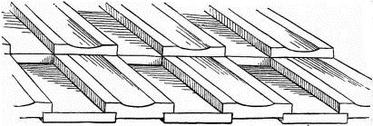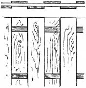 In long rooms one is oftentimes surprised to see boards of great width composing the ceiling, and apparently continuous from one end of the room to the other. What appears to be a [pg 31] single board is in fact composed of a number of short lengths. The matching of the grain and color is accomplished by taking two adjacent boards in a bundle of boards, as previously figured and described, and placing them so that the same ends come together (fig. 24),—care being taken, of course, to have the joints come directly over the cross-pieces. The graining of the wood becomes continuous, each line of the grain and the color being of course duplicated and matched in the other board. Sometimes a number of lengths of board may be continued in this way, and yet from below the appearance is that of a single long piece.